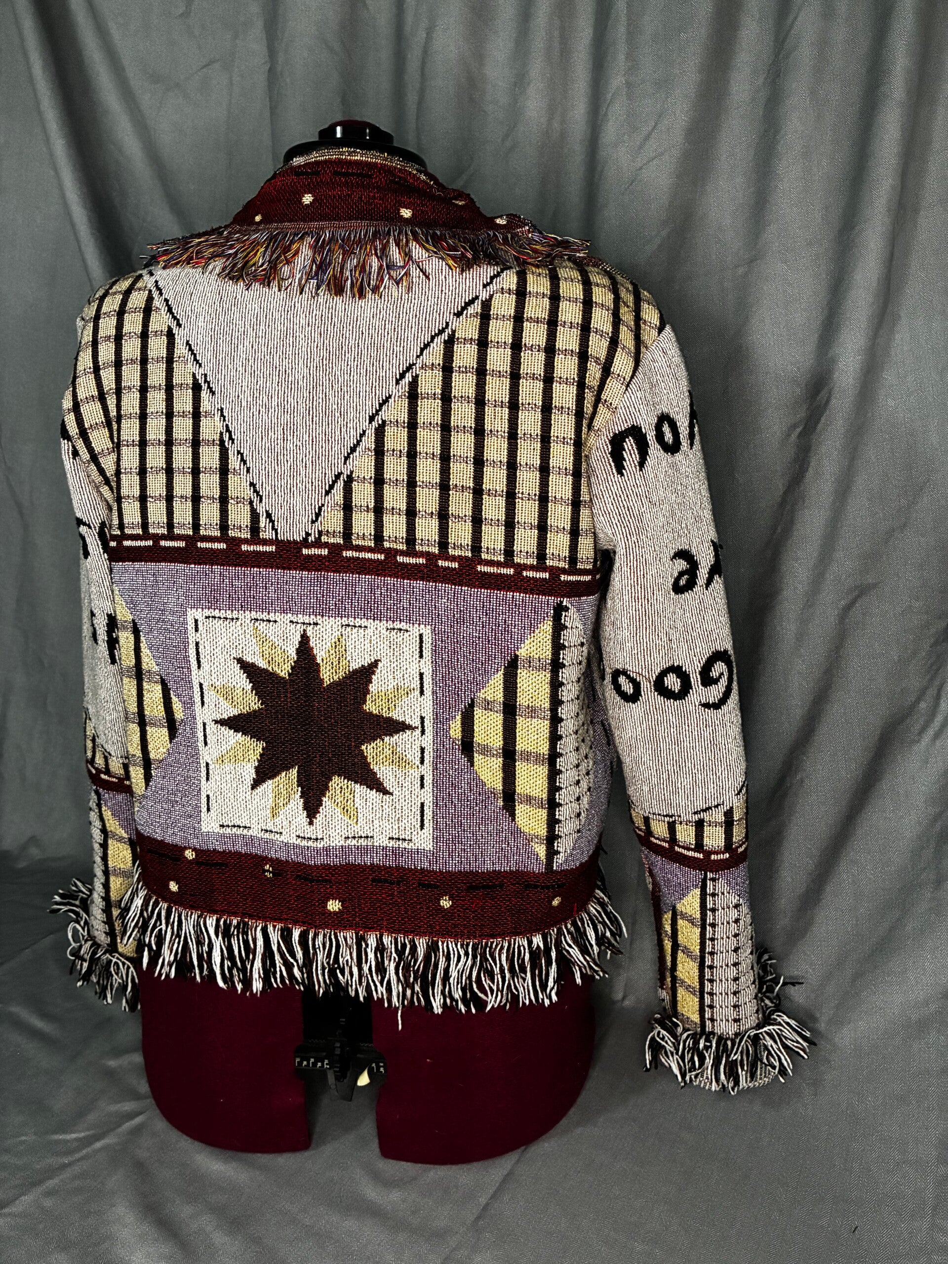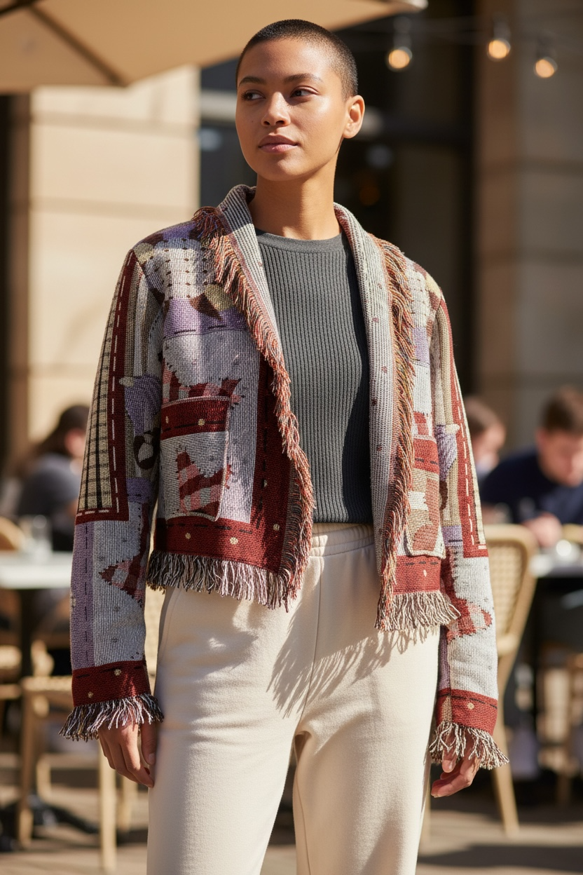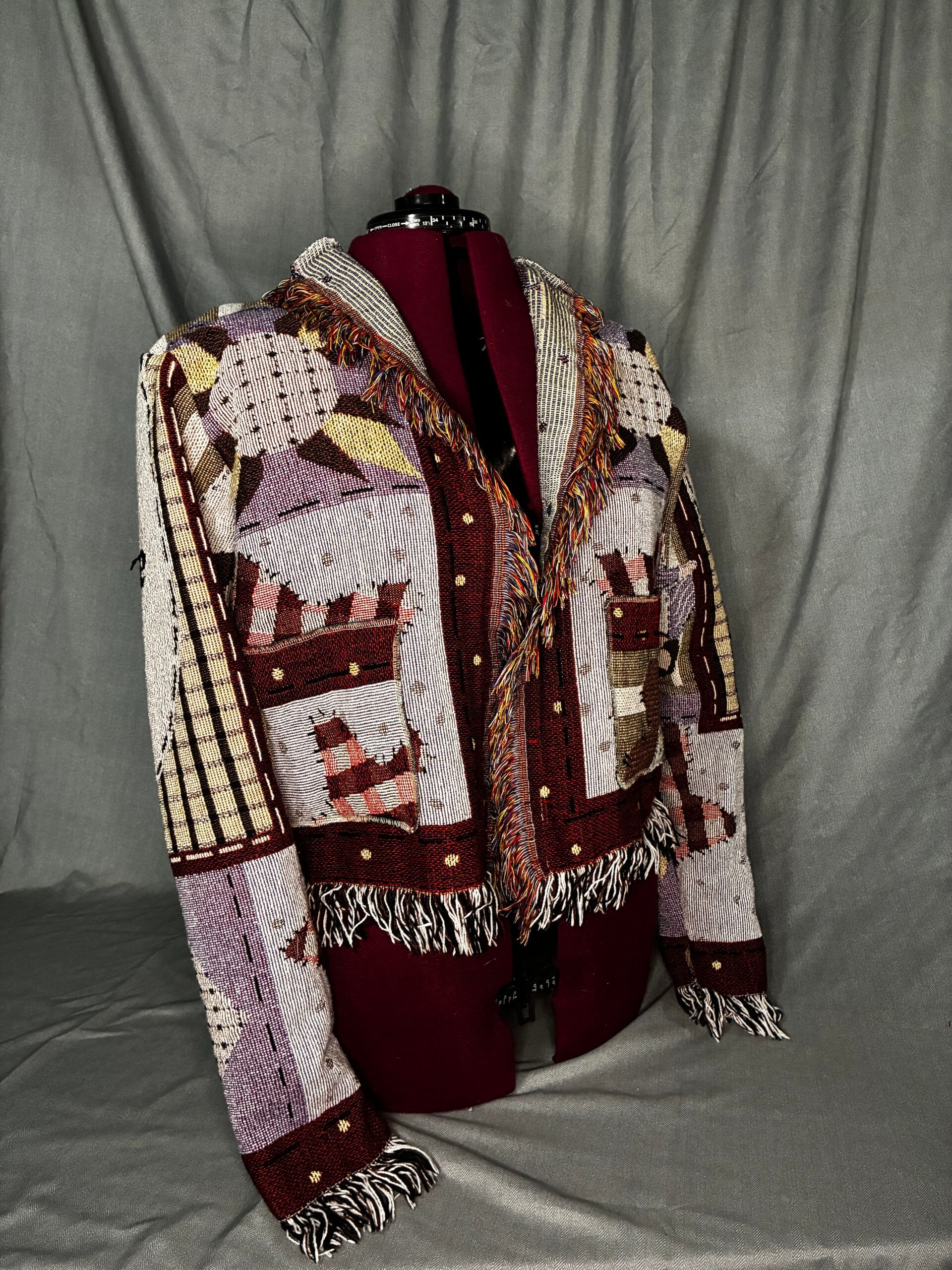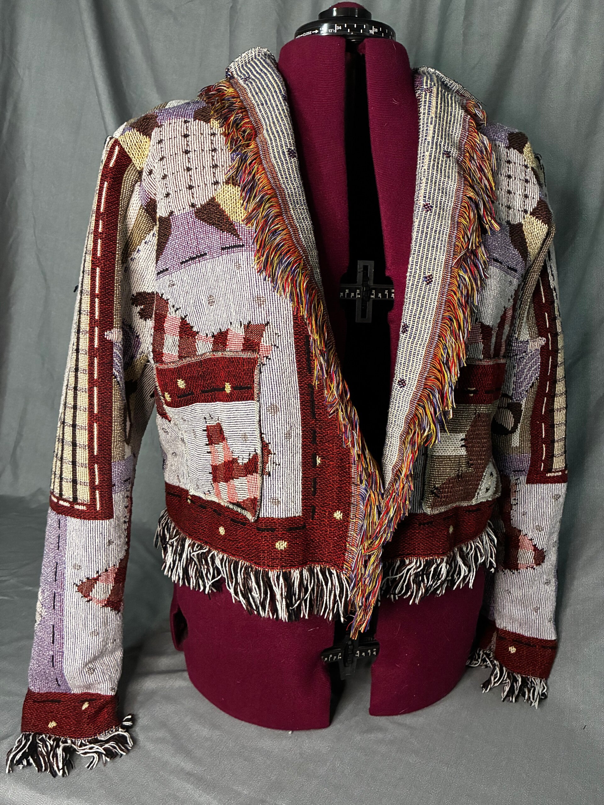 Women's medium cropped jacket. Made from woven tapestry blanket. Warm and comfortable